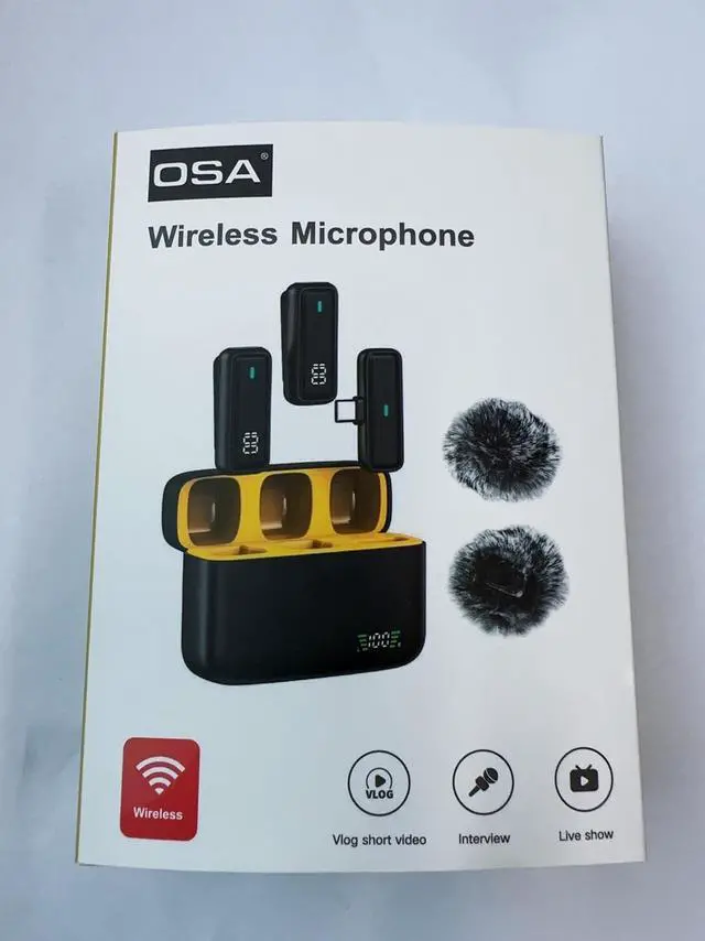 The Package Includes: 1*Charging Case, 2*Microphones, 1*Transmitter, 1*Charging Cable, 2 Wireless Microphone wind caps, 1* Instruction Book.