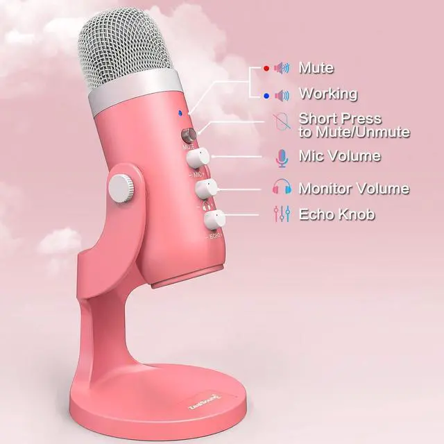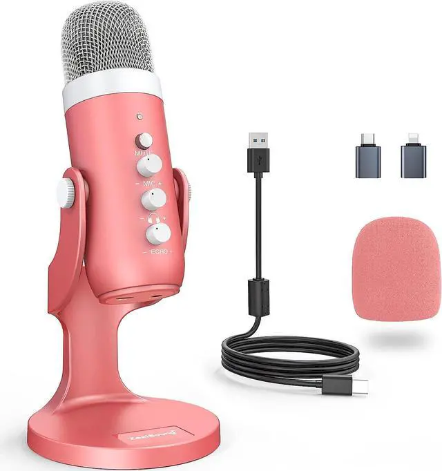 [Useful Accessories] 1 x Solid built metal construction and anti-vibration stand base (avoid moving); 1 x Heavy-duty professional computer USB gaming top-address microphone-k66 series Pink color; 1 x 70.87 inch USB Audio Cable; 1 x Type C Adapter for the Newest MacBook and all other Type C devices (Phone, tablets and PC); 1 x Adapter for New iPhone and iPad Pro; 1 x Microphone Foam Windscreen (block blasting sound); 1 x User manual and free Technical Support.