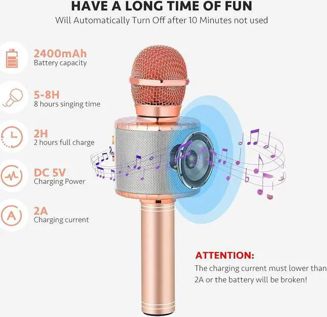 More FeaturesCharge for 2 hours and sing for 360 minutes! It will be turned off automatically 10 minutes after you leave. This microphone adopts a new lightweight design, allowing you to hold more effortlessly, suitable for adults and children will also like it.