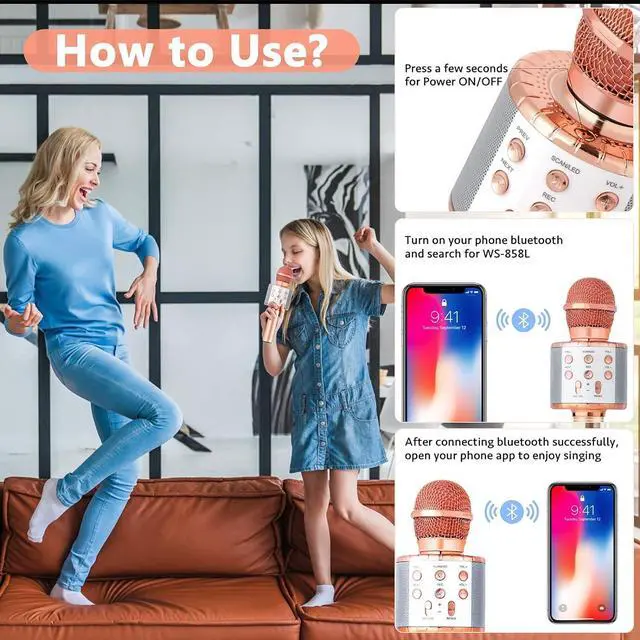 3 Connection Ways Mic Kid Microphone: Bluetooth Connection and Cable Connection-long press the power button, only need to search for WS-858L to complete the pairing. Bluetooth signals can be received within 10m. It is more convenient to use wireless. You can also store songs in the TF card, and then sing at any time!