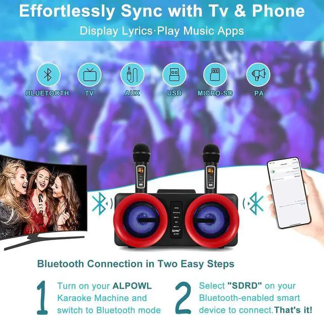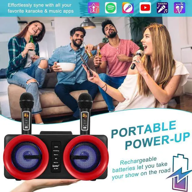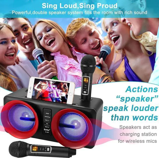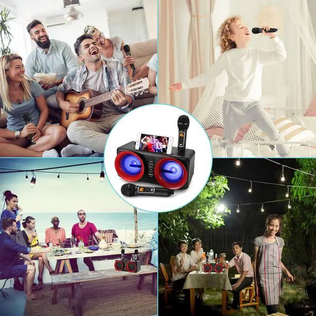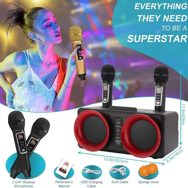 Excellent Karaoke systemPortable karaoke machine system has built-in 2*15W speaker is designed with multi-functions for full-range stereo sound reproduction, equipped with a high-performance audio driver and an advanced digital signal processor, intelligently eliminates noise, making the sound clearer, with stronger bass and more moderate volume, giving you shocking audio-visual effects. Perfect for party, gatherings outdoor/indoor activities. A perfect Christmas gift for kids & adults.