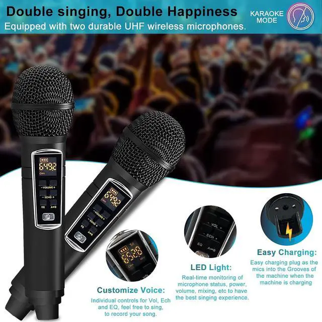 2 Karaoke Microphones Our machine is equipped with two UHF wireless microphones. They use the latest Super high frequency technology to ensure stable signals when singing. The microphones will automatically pair with the machine, and the working range can reach 33 feetTwo microphones use only noise reduction technology, and professional audio processors can adjust high and low frequencies to ensure sound quality while transmitting your voice more efficiently for a better singing experience