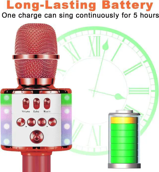 Long-Lasting Battery- Our karaoke Microphone Singing has a built-in 2400 mAh lithium polymer battery, which can listen to songs continuously for 12 hours, and can last for 5 hours of a single charge. Fast charging speed and long service life.