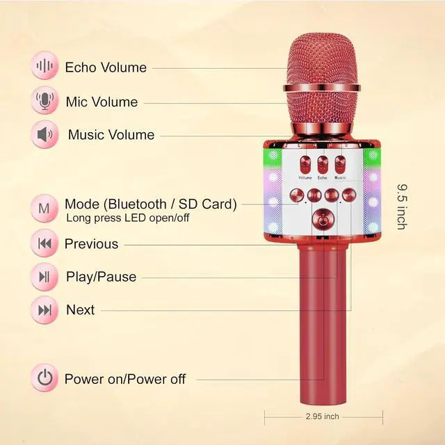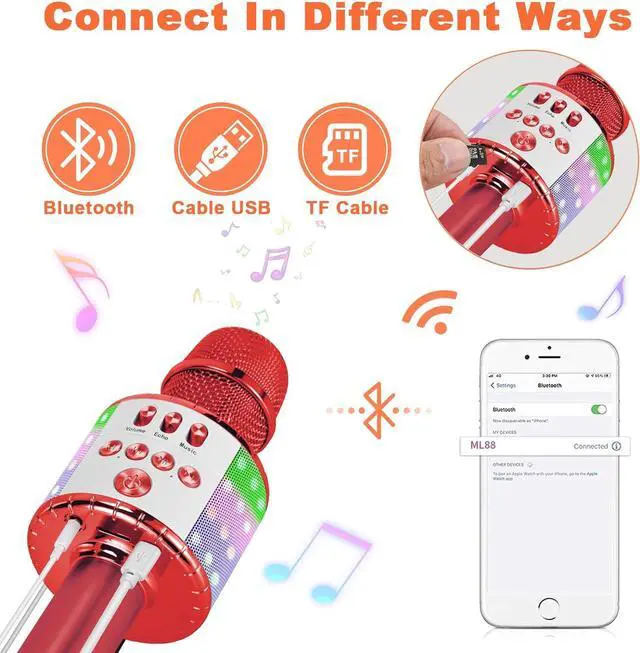 Easy to Use & Two Ways Connection Kids Microphone- Multi-function buttons can adjust music, echo, volume, switch the previous and next song mode. Our karaoke microphone is easy to connect to your smart phone via wired and Bluetooth, start the singing application on the phone, and can also support TF card and U disk to play music. (Not included)
