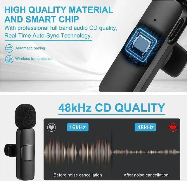 Superior Noise Reduction & Real-time Auto-syncThis omnidirectional wireless lavalier microphone is built with professional-grade intelligent noise reduction chips, providing effective identification of the original sound and clear recording in noisy environment. The real-time auto-sync technology extremely reduce the time of video post-editing, supporting a better experience in videos being watched.