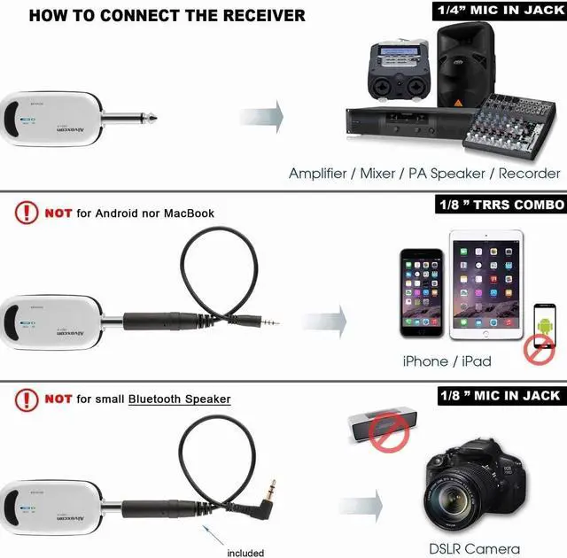 Multi Applications - Wireless receiver with universal 1/4 plug works with mixer, PA speaker w/ 1/4 MIC IN Jac, and smartphone, ideal for presentation, preaching, training, fitness /exercise instructor, wedding