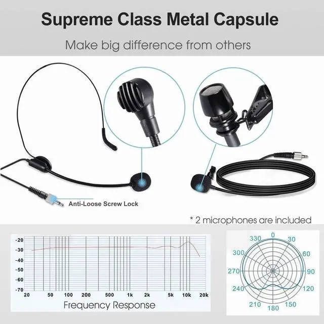 WIRELESS HEADSET & LAVALIER Condenser headset microphone offers secure wear for vocal performance, clip on microphone offers invisibility on shirt collar, both make hands free to use in interview, classroom, gym, stage, church, meeting