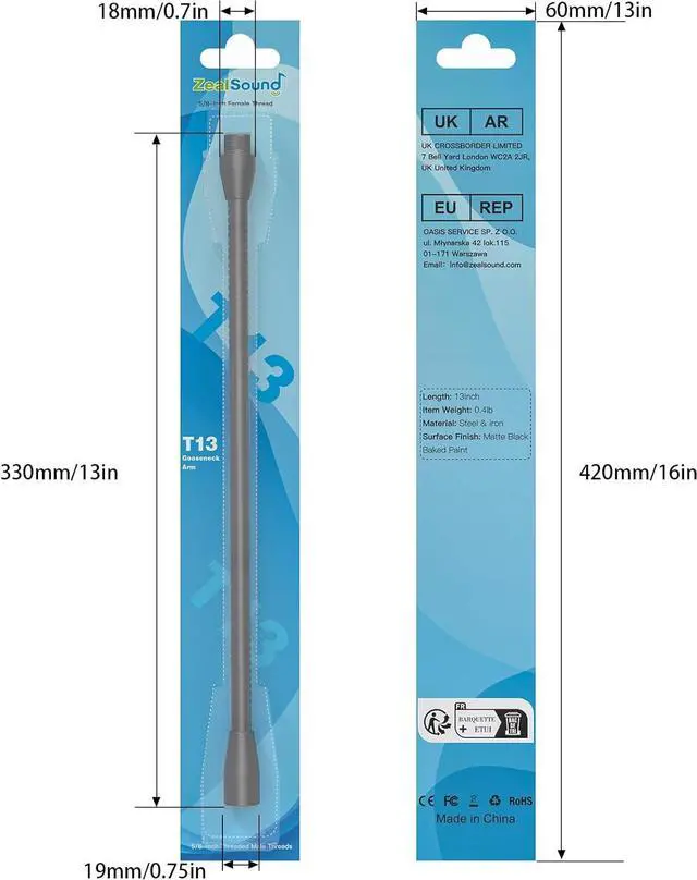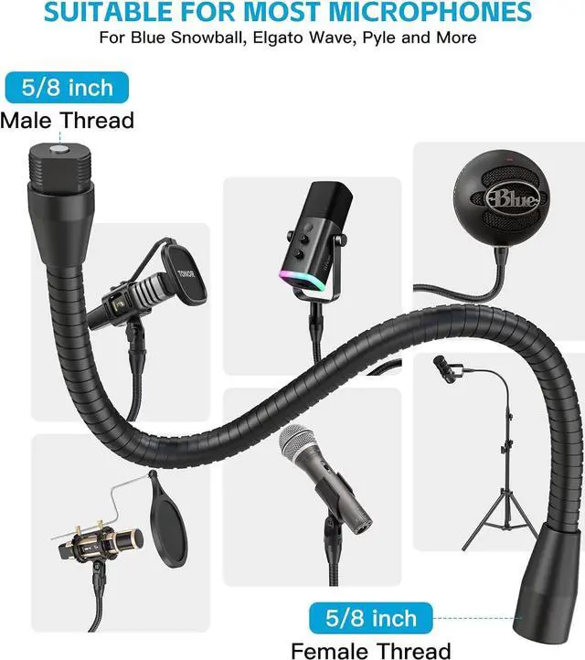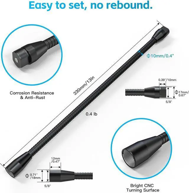 Convenient Compatibility Seamlessly integrate this 13-inch gooseneck stand extension into your setup with both 5/8'' male and female threads. The standardized thread size ensures compatibility with various equipment, including cameras, microphone stands, iPad stands, tablet floor stands, and even lighting equipment, such as magnifying makeup mirrors with light. Effortlessly mix and match devices with this universal thread size, simplifying setup for added convenience. The gooseneck extension adeptly adjusts to varying heights and angles to meet your needs.