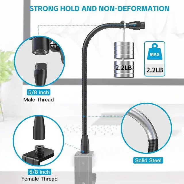 Impressive Weight Bearing Rely on the robust design of this universal gooseneck stand arm with an impressive weight-bearing capacity of 2.2 lbs. Whether mounting popular microphones like Blue Snowball and HyperX SoloCast or creating DIY stands for iPads, tablets, phones, or floor-standing devices, rest assured this extendable gooseneck arm can handle the load with ease. Experience stability and peace of mind in all your creative endeavors.