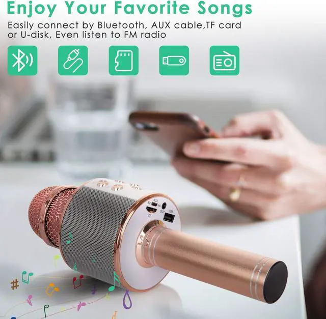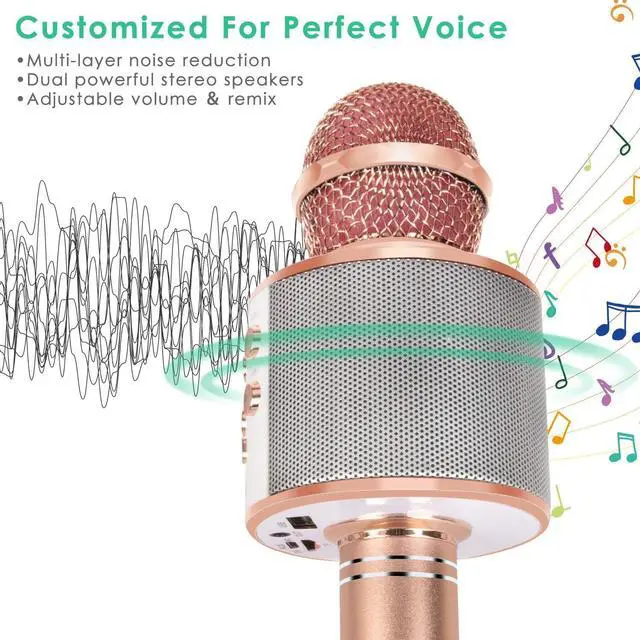 Designed for ProfessionalsKaraoke Microphone with 3 layered anti noise filter head, which can effectively reduce the air flow and wind noise produced when singing and dust interference, distortion free and anti-howling! Built-in dual high-quality large speakers bring 360-degree super surround feeling, immersive!