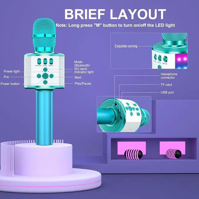 Multi-functional Design: This 4-in-1 microphone not only serves as a Bluetooth speaker and karaoke mic but also functions as a music player and voice amplifier, offering endless entertainment possibilities for all ages.