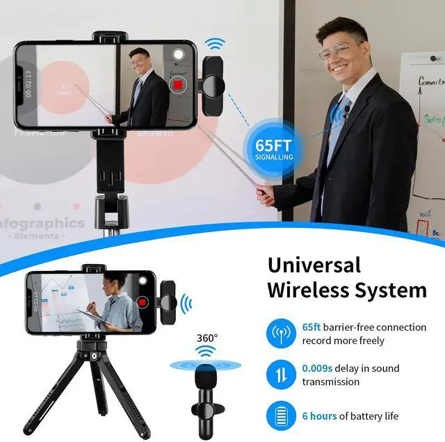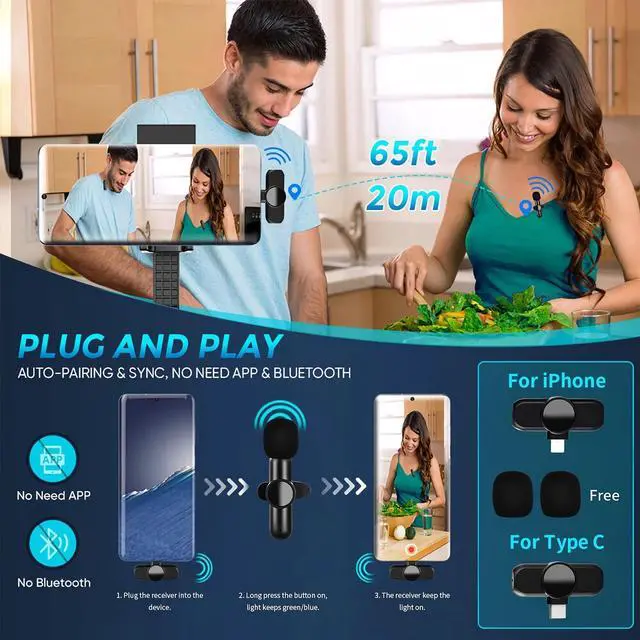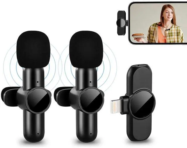 Capture crystal-clear audio on your iPhone or iPad with this 2-Pack of Wireless Lavalier Microphones. Designed for seamless plug-and-play operation with Lightning port iOS devices (not compatible with USB-C), these microphones are ideal for interviews, vlogs, podcasts, livestreaming, and TikTok. Enjoy the freedom of a stable 65ft wireless range and up to 6 hours of battery life on a single charge. Featuring omnidirectional pickup and AI noise cancellation, these mini mics ensure clear and natural sound capture from all directions, while the included windshields minimize wind noise. The receiver conveniently allows you to charge your device during recording, ensuring uninterrupted content creation.