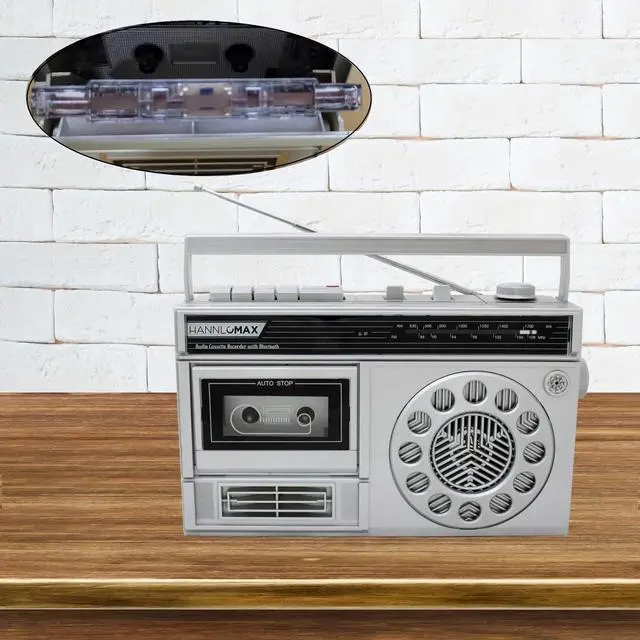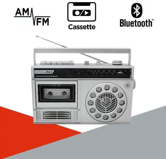 Portable AM/FM Radio Cassette Recorder with Bluetooth, Records from Built-in Mic or Radio, Headphone Jack, AC/DC operation.