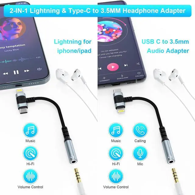 Multi-function Dongle: Our compact 2-in-1 USB C & iPhone to 3.5 mm aux adapter serves as a versatile solution for connecting your devices without an audio jack to headphones, headsets, speakers, and other audio devices. It allows you to easily make calls, control volume, and pause/play music using the function keys on your headphones (calling function not supported on iPhone). This adapter meets all your phone's audio needs in one convenient accessory.