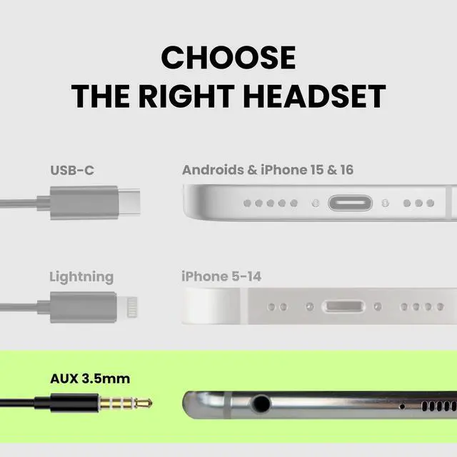 A: This version has a 3.5mm AUX plug, compatible with most laptops and older phones. For USB-C or Lightning devices, please choose the right version from our store.