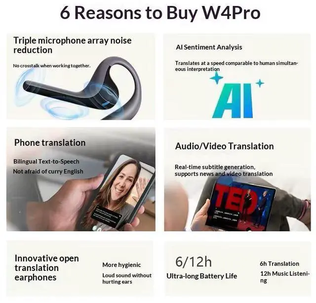 W4 Pro AI Simultaneous Translation Headphones with for Type-C Charging Offline/Online Translation