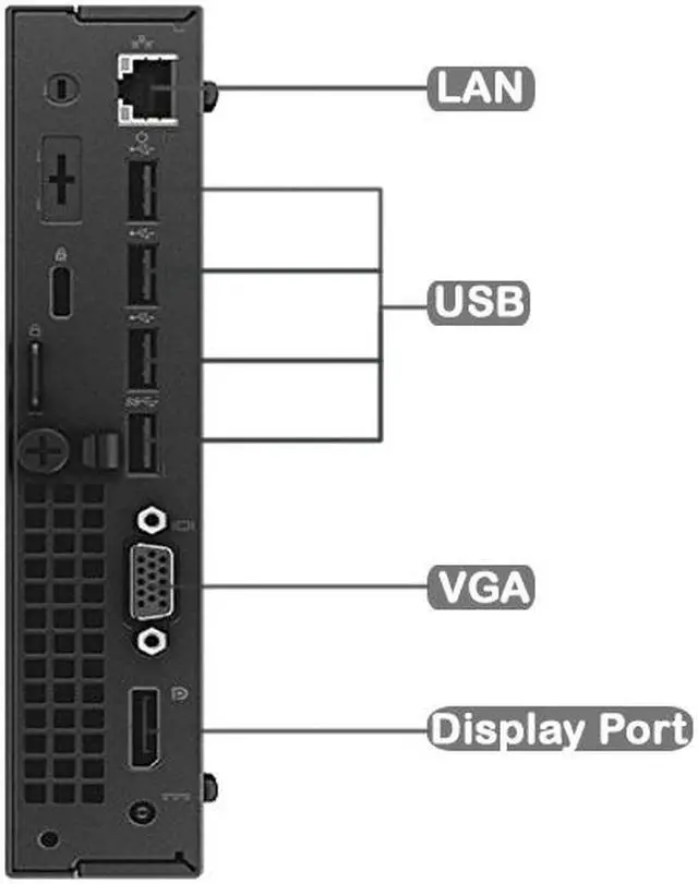 • 2 USB in Front, 4 USB in the Back, Headset Port, Microphone Port, 1 Gigabit Network Port, 1 VGA Port, 1 Display Port, 1 HDMI.
