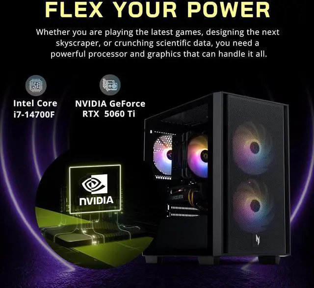 The Acer Nitro 60 Gaming Desktop delivers powerful performance with the Intel Core i7-14700F processor and NVIDIA GeForce RTX 5060 Ti graphics. Experience ultra-smooth gameplay, realistic ray-traced visuals, and fast multitasking for demanding games and creative tasks. Designed for gamers who crave speed and precision, it ensures an immersive and responsive gaming experience every time.