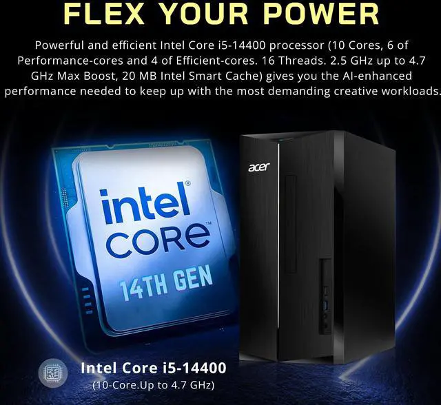 The Acer Aspire Desktop combines the Intel Core i5-14400 processor for strong multitasking performance, Intel UHD Graphics 730 for smooth 4K visuals, and a reliable keyboard and mouse for a complete, ready-to-use setup.