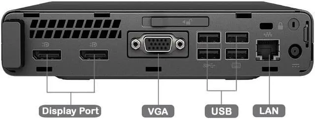 • 2 USB in Front, 4 USB in the Back, Headset Port, Microphone Port, 1 Gigabit Network Port, 1 VGA Port, 1 Display Port, 1 HDMI.