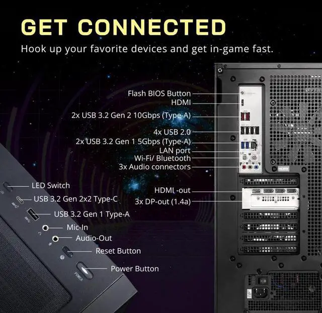 • Windows 11 Home: 19.4" x 19" x 9.1", 26.9 lbs. Ports: front: 1x USB-C, 1x USB-A, 1x Audio-out, 1x Mic-in; back: 1x HDMI, 1x LAN Port, 8x USB-A, 3x Audio ports, 1x HDMI out, 3x DP-out. Wi-Fi 7 + Bluetooth 5.3.