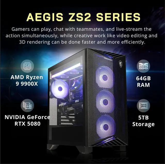 MSI Aegis ZS2 Gaming Desktop, AMD Ryzen 9 9900X, 64GB DDR5, 5TB Storage (4TB SSD+1TB Docking Station Set), NVIDIA GeForce RTX 5080, Keyboard & Mouse, Win 11, Black