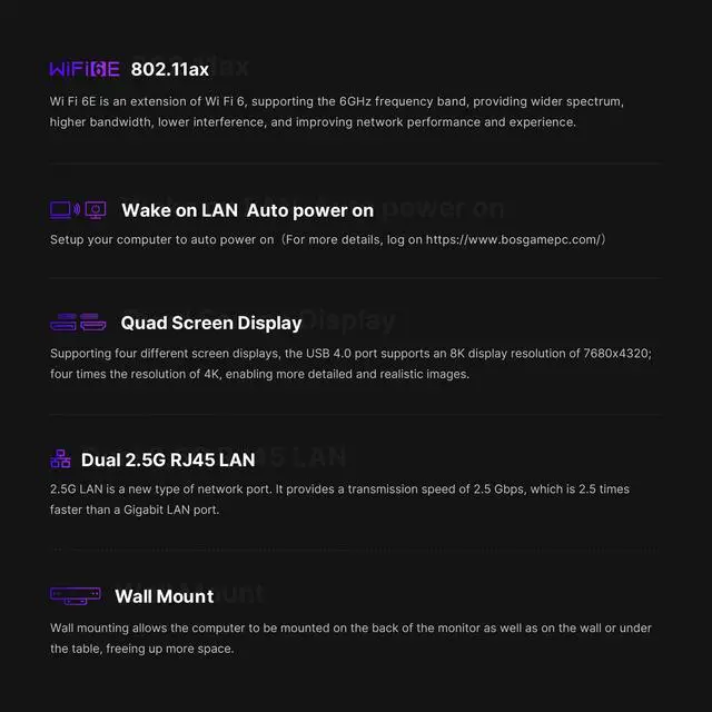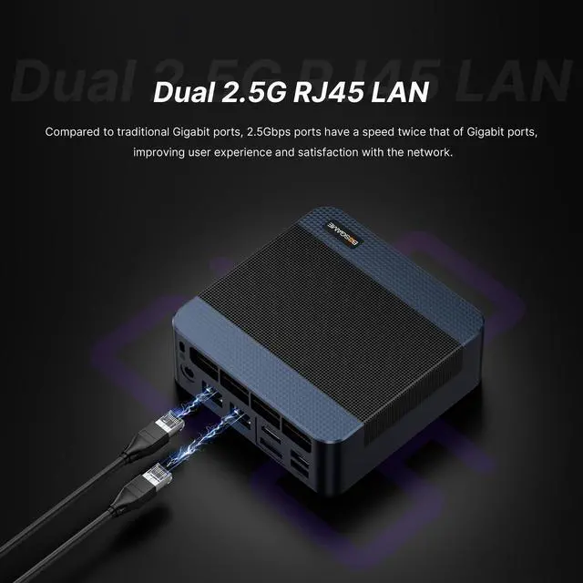 • Dual 2.5G LAN The mini computer connected with Wi-Fi6E and Bluetooth 5.2, paired with dual 2.5G RJ45 LAN ports for blazing-fast wired internet speeds. It features Auto Power On and Wake-on-LAN for convenient remote management. Backed by a 1-year free warranty, 24/7 support, and lifetime technical assistance.