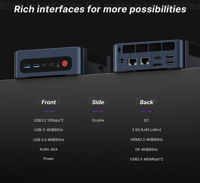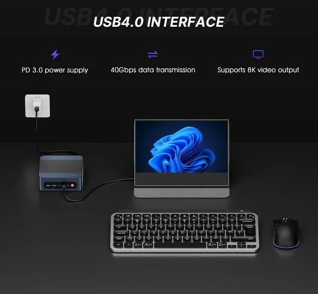 • Dual Full-featured USB 4.0 Ports SB4.0 ports deliver up to 40Gbps transfer speeds, supporting charging, multiple monitors, and external drives via a single port. Combined with two full-featured Type-C ports, HDMI, and DP, the mini pc supports dual 8K displays or up to four 4K displays for gaming, media playback, and productivity tasks.