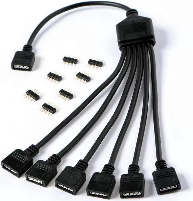 CABLE: 1 black 11.8 inch 1 to 6 splitter. Each splitter cable is equipped with 6 male pins, 6 x RGB outputs. 7 x Male plug adapters included, when ready to use, insert and assemble.