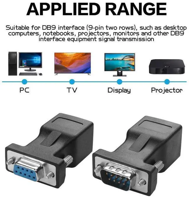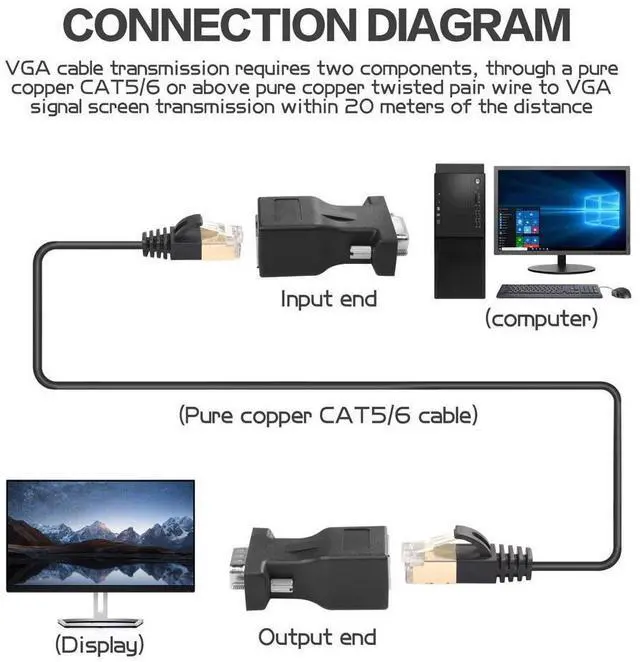 YACSEJAO VGA to RJ45 extension signal amplifier is suitable for VGA connectors (15 pins), such as desktop computers, notebooks, projectors, monitors and other similar interface equipment signal transmission.