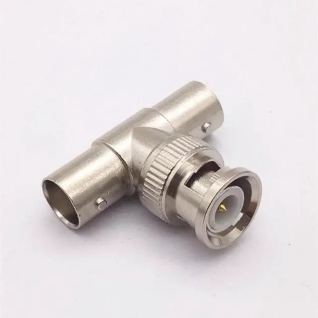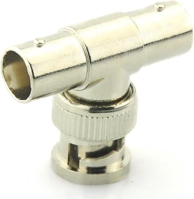 This nickel-plated T-shaped coaxial adapter has 2 BNC female connectors opposite one another with 1 BNC male connector at a right angle.