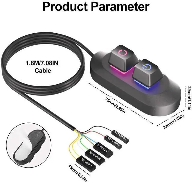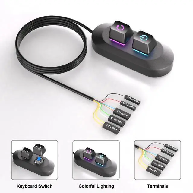 Experience satisfying tactile feedback with dual mechanical keyboard-style buttons (Power & Reset) enhanced by vibrant RGB gradient lighting. Installation is plug-and-play: simply connect to your motherboard's POWER SW and RESET SW pins using the included 1.8-meter cable and secure the unit with its industrial-strength adhesive base.