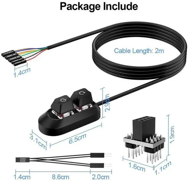 Package included: 1x Computer Power Switch ON/OFF with 2M cable; 1x 1 to 2 splitter board; 1x 1 to 2 splitter cable; 1x adhesive stickers; 1x installation manua.