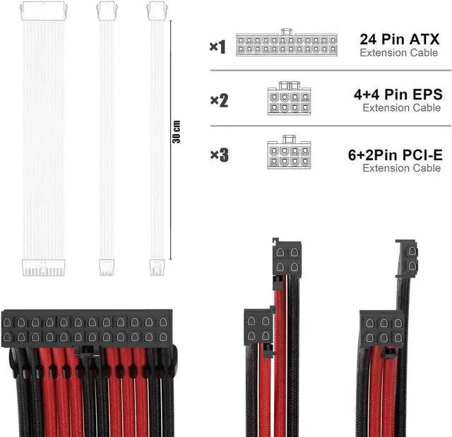 PSU Cable Extension Kit 30CM Length with Combs,1x24Pin/2x8Pin(4+4) EPS/3x8Pin(6P+2P) PCI-E/PC Sleeved for ATX Power Supply,( Black & Red)