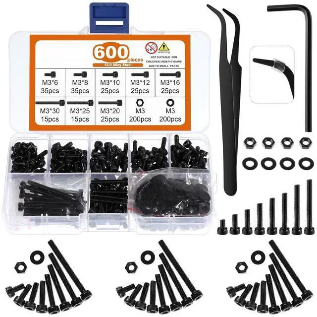 600 M3 material screw kits Two custom-made hexagonal buttons. A flat circle and a pair of tweezers, a total of 35 Black galvanizing treatment technology and oil-free The thickened storage box is equipped with internal labels and external labels