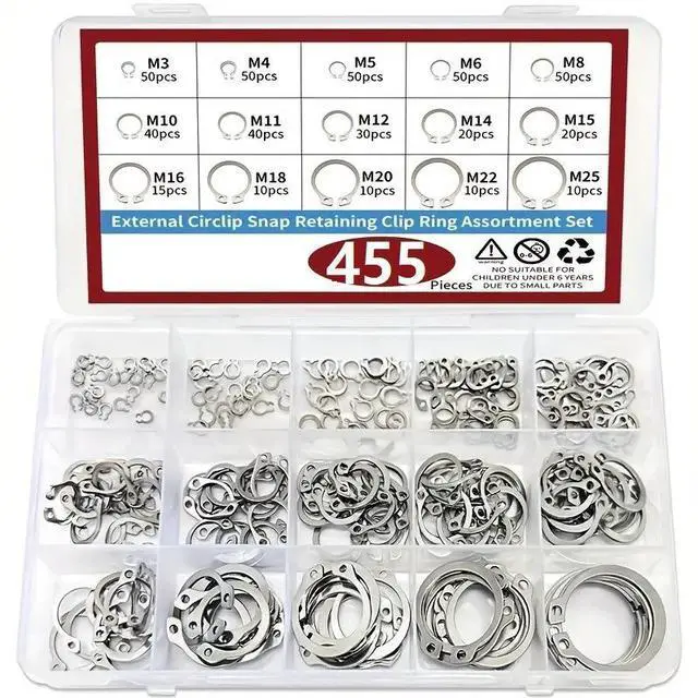 455 pieces of external fixed ring buckle ring combination set, external C-shaped clamp set, 15 types of 304 stainless steel M3-25