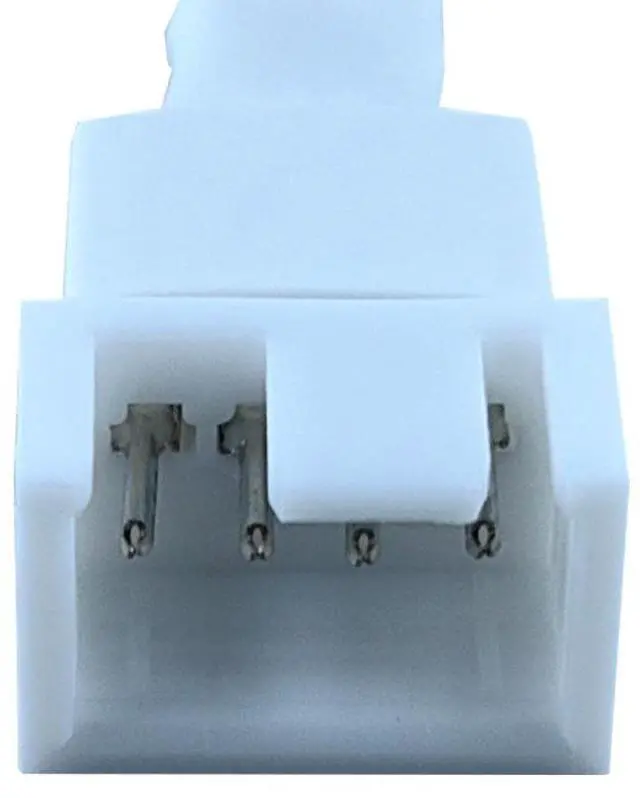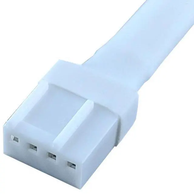 Product Interface: One end is a small 4-pin connector for the motherboard, and the other end is a small 4-pin connector for the fan