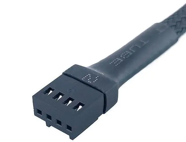 Product Interface: One end is a small 4-pin connector for the motherboard, and the other end is a small 4-pin connector for the fan