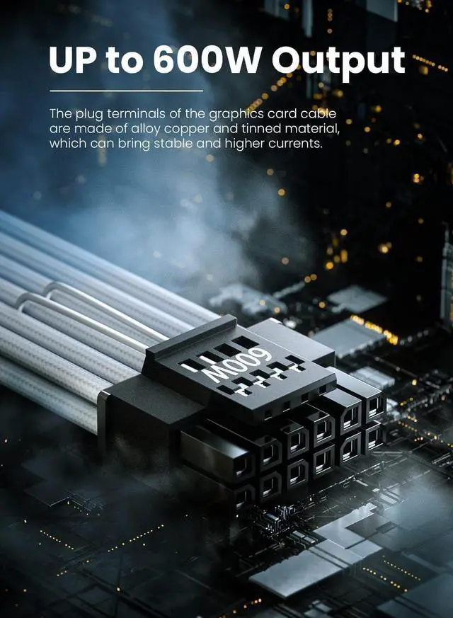 Up to 600W OutputFasgear PSU extension cable supports up to 600W output. The plug terminals of the graphics card cable are made of alloy copper and tinned material, which can bring stable and higher currents.