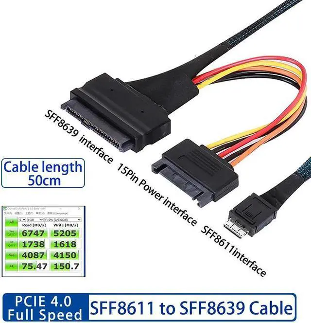 MiniSAS Oculink 4.0 SFF-8611 4i 42Pin to SFF-8639 U. 2 Cable 8611 to 8639 with SATA Power Supply Support 2.5" NVMe SSD for Mining