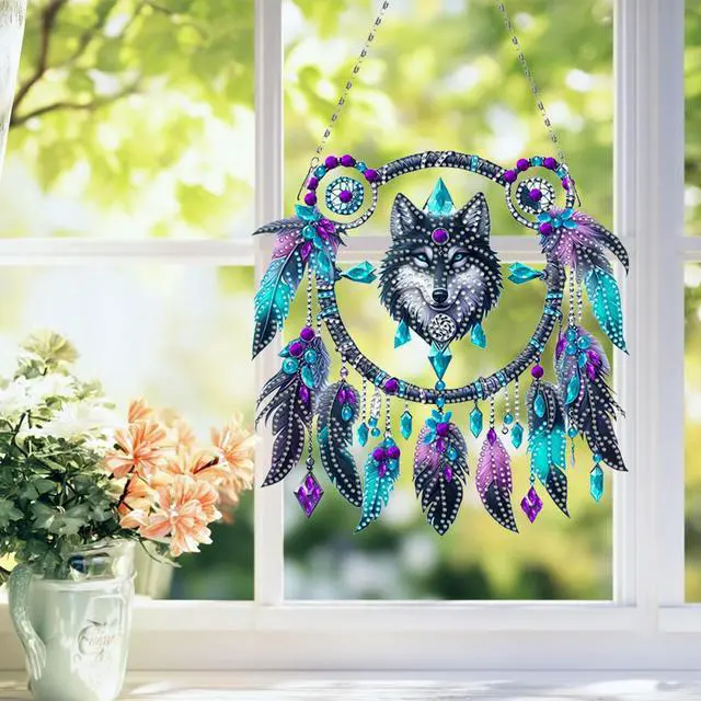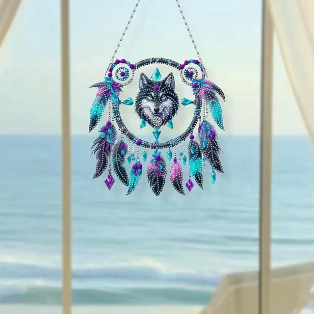 2D Flat DIY Diamond Painting Art Pendant Window Hanging Wolf Dream Catcher