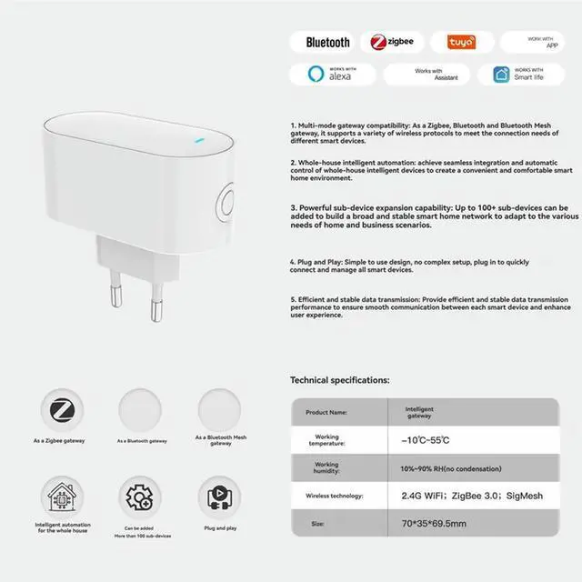 Tuya Zigbee Gateway Hub Multi-Mode Zigbee Gateway Bridge Bluetooth Mesh Hub For Home Automation EU Plug