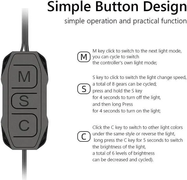 Simple button design, simple operation and practical function. (M key click to switch to the next light mode, you can cycle to switch the controller's own light mode; S key to click to switch the light change speed, a total of 8 gears can be cycled; press and hold the S key for 4 seconds to turn off the light, and then long Press for 4 seconds to turn on the light; click the C key to switch to other light colors under the same style or reverse the light, long press the C key for 5 seconds to switch the brightness of the light, a total of 6 levels of brightness can be decreased and cycled).