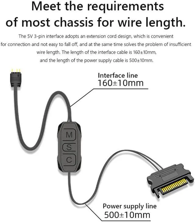 Meet the requirements of most chassis for wire length. The 5V 3-pin interface adopts an extension cord design, which is convenient for connection and not easy to fall off, and at the same time solves the problem of insufficient wire length. The length of the interface cable is 160±10mm, and the length of the power supply cable is 500±10mm. (Note: SATA power supply interface, directly connected to the computer power supply does not need the motherboard to support 5V 3-pin ARGB to control the lighting of ARGB products).