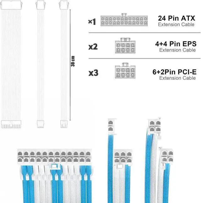 PSU Cable Extension Kit 30CM Length with Combs,1x24Pin/2x8Pin(4+4) EPS/3x8Pin(6P+2P) PCI-E/PC Sleeved for ATX Power Supply,( White & Blue)