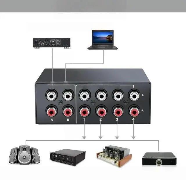 FOR 4 Way Bi-Directional RCA Stereo Audio Switch Selector 4X2/2X4 L/R Sound Channel Audio Switcher Splitter with OFF Button
