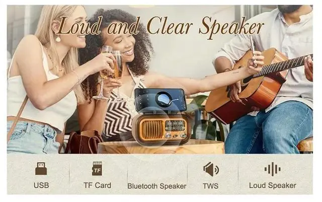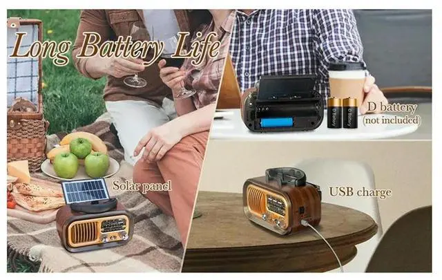 Retro Portable Radio - AM/FM/SW, Bluetooth, Solar/D /USB-C, TWS, TF/USB Playback, Vintage Sound