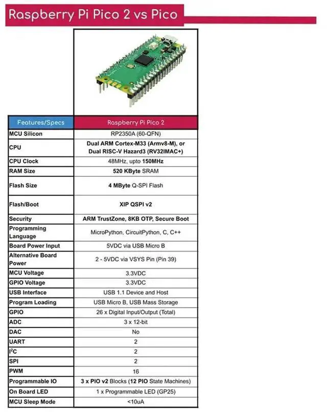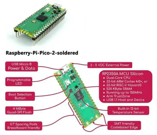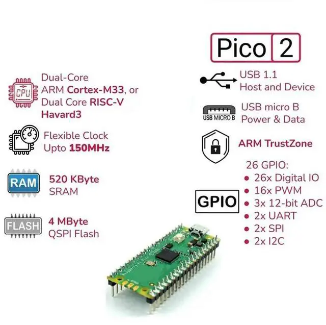For Raspberry Pi Pico 2 Development Board RP2350 Pico2 ARM Cortex-M33 and RISC-V Hazard3 520KByte 4MByte QSPI Flash