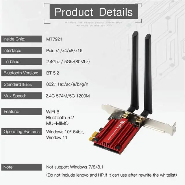 1800Mbps 6 MT7921 PCI Express Wireless Adapter Bluetooth 5.2 Dual Band 802.11AX/AC Wi-Fi Network Card 10 11 Dur