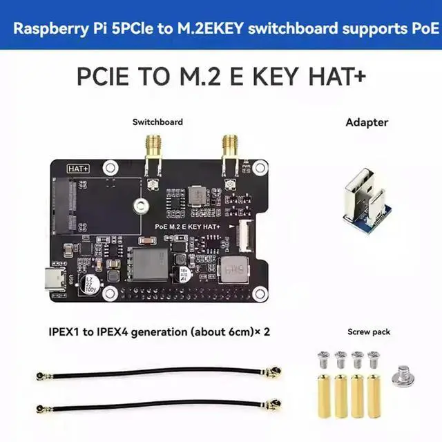 For Raspberry Pi 5 PCIe to M. 2 E KEY with PoE HAT+ Supports NGFF Wireless Network Card/Bluetooth for RPI 5